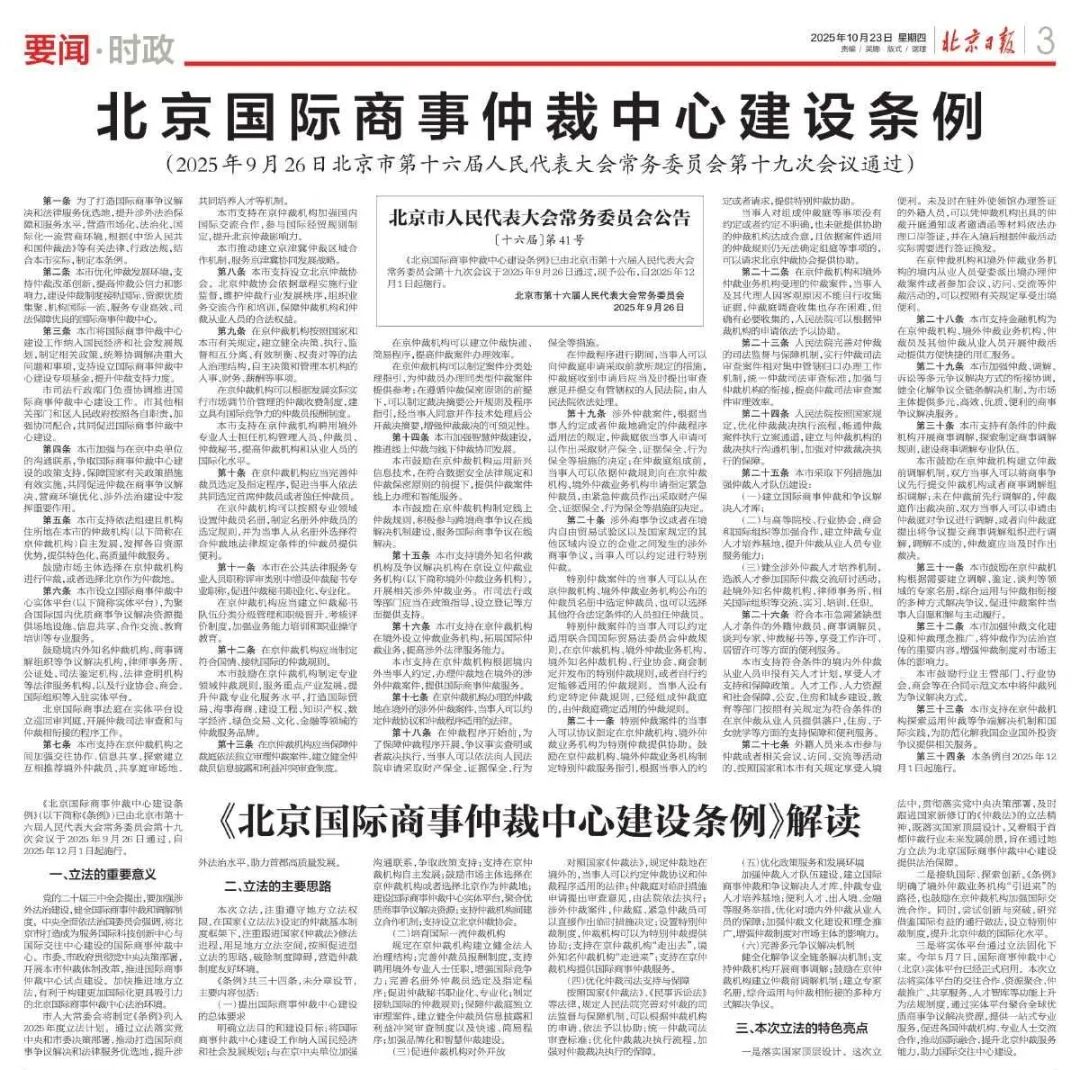 《北京国际商事仲裁中心建设条例》(以下简称《条例》)已由北京市第十六届人民代表大会常务委员会第十九次会议于2025年9月26日通过,自2025年12月1日起施行。