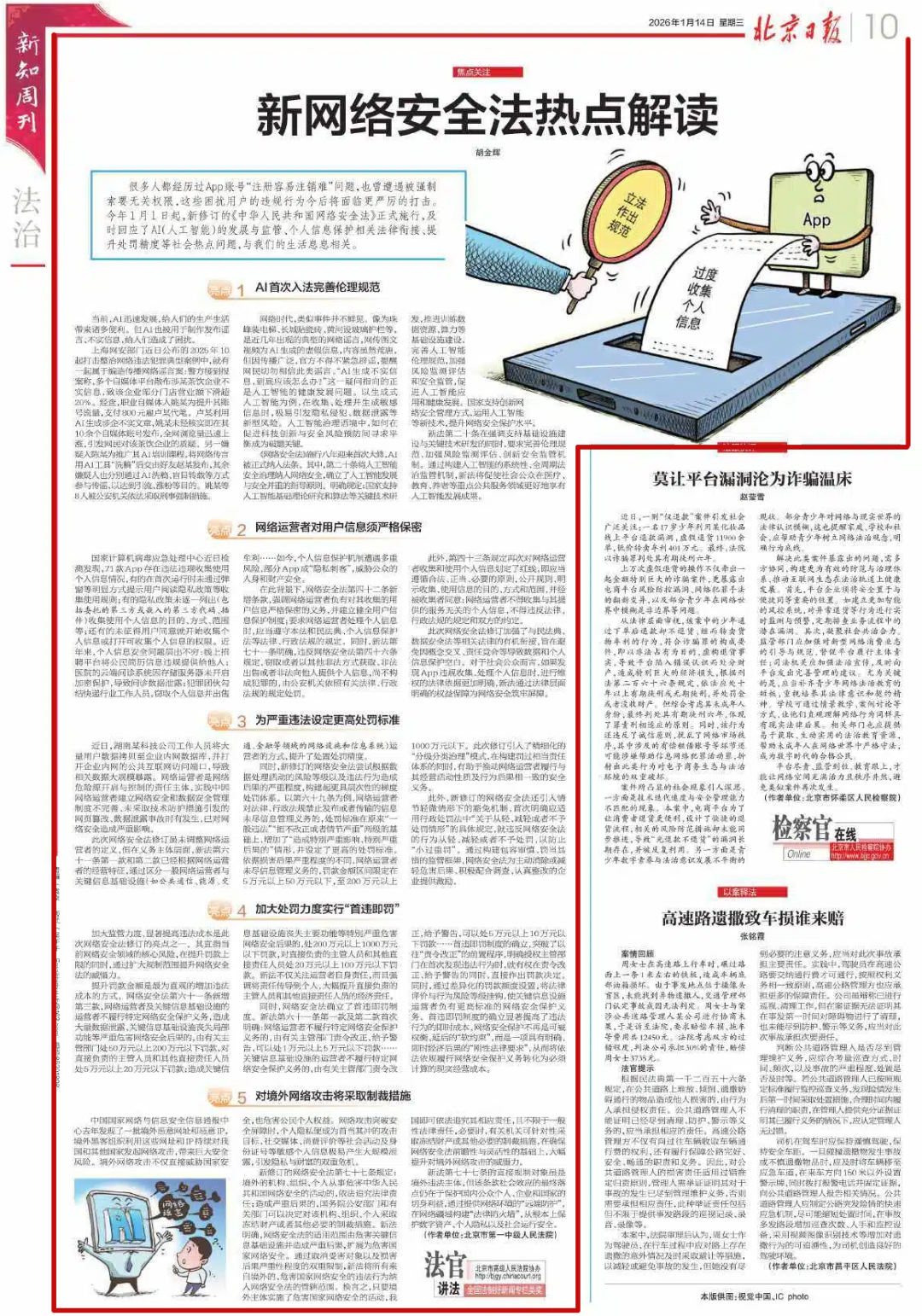 很多人都经历过App账号“注册容易注销难”问题,也曾遭遇被强制索要无关权限,这些困扰用户的违规行为今后将面临更严厉的打击。今年1月1日起,新修订的《中华人民共和国网络安全法》正式施行,及时回应了AI(人工智能)的发展与监管、个人信息保护相关法律衔接、提升处罚精度等社会热点问题,与我们的生活息息相关。
