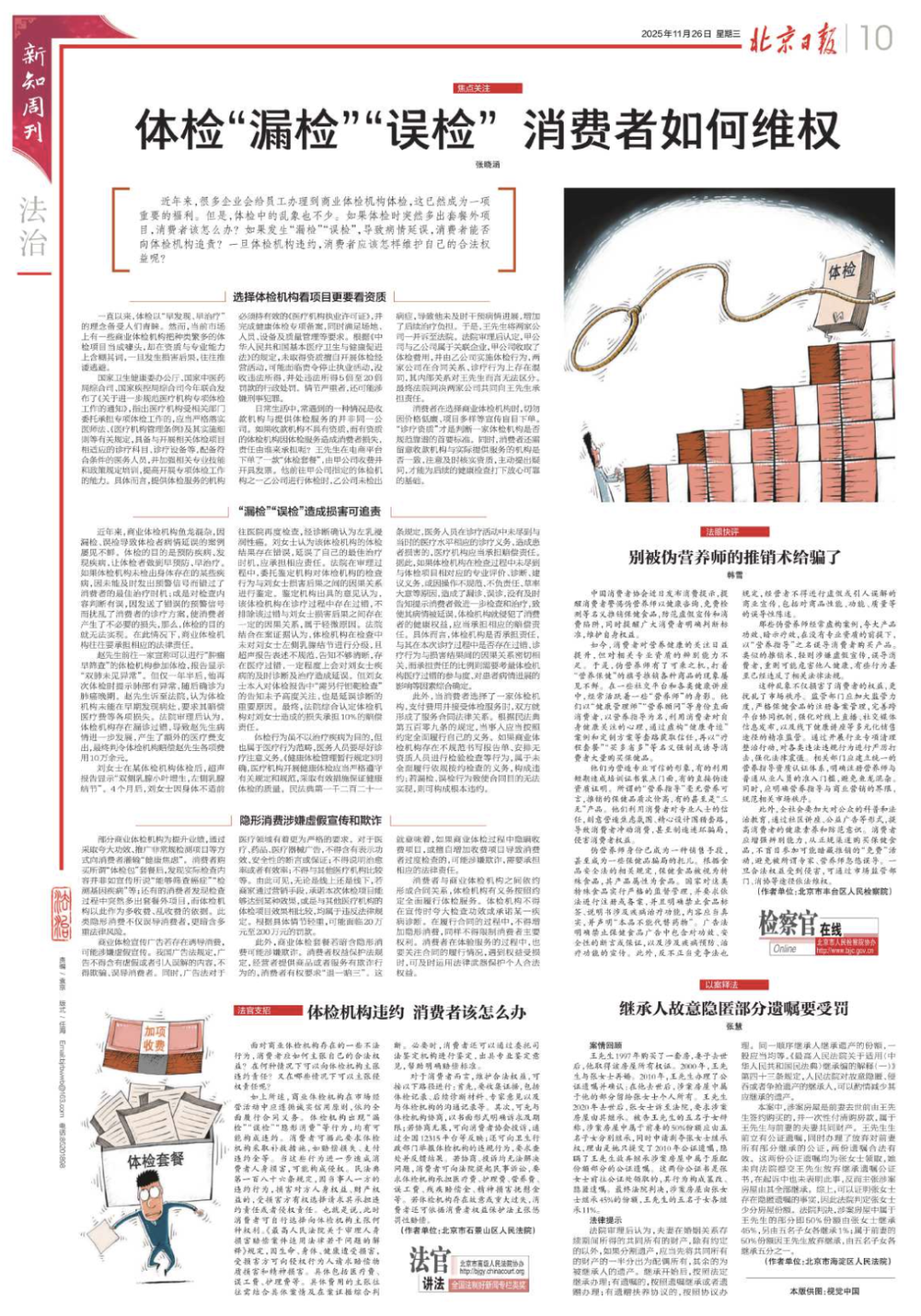 消费者与商业体检机构之间依约形成合同关系,体检机构有义务按照约定全面履行体检服务。体检机构不得在宣传时夸大检查功效或承诺某一疾病诊断。在履行合同的过程中,不得增加隐形消费,同样不得限制消费者主要权利。消费者在体验服务的过程中,也要关注合同的履行情况,遇到权益受损时,可及时运用法律武器保护个人合法权益。