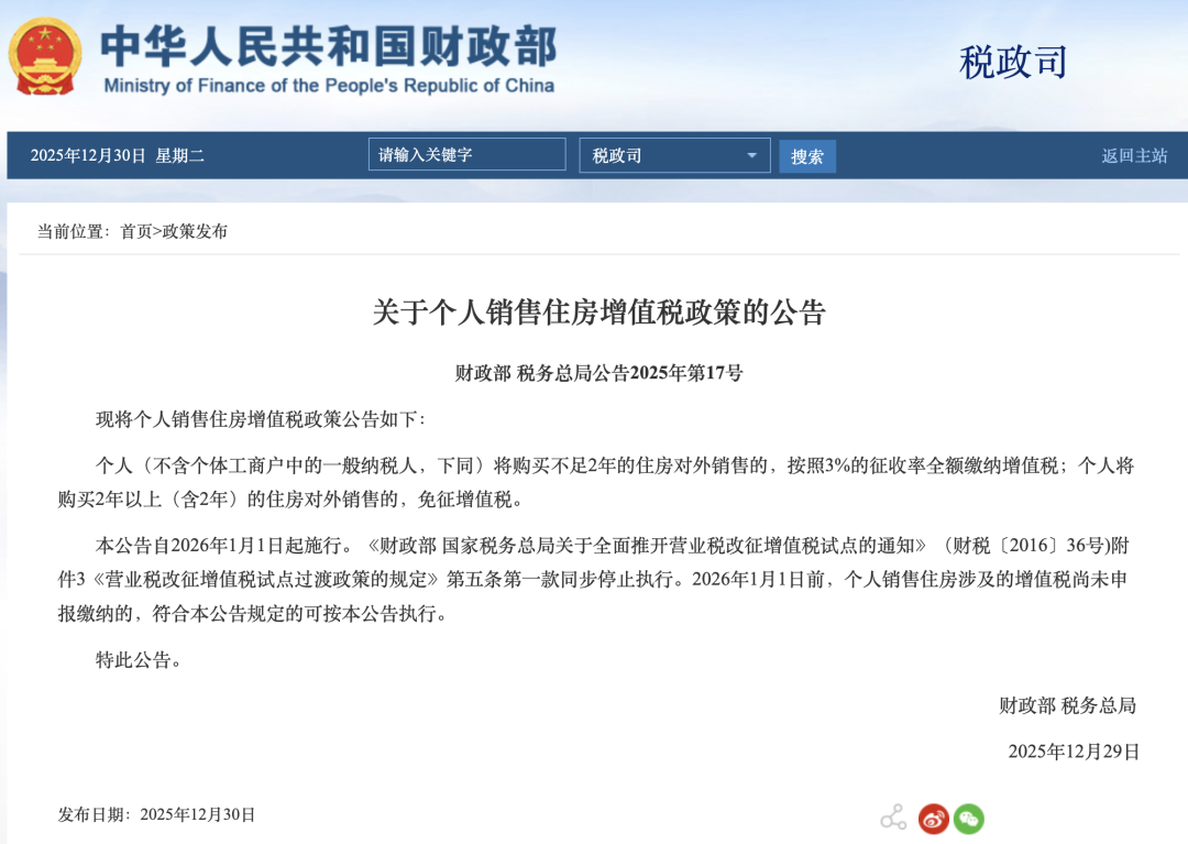 12月30日,据财政部网站消息, 财政部、税务总局发布《关于个人销售住房增值税政策的公告》——