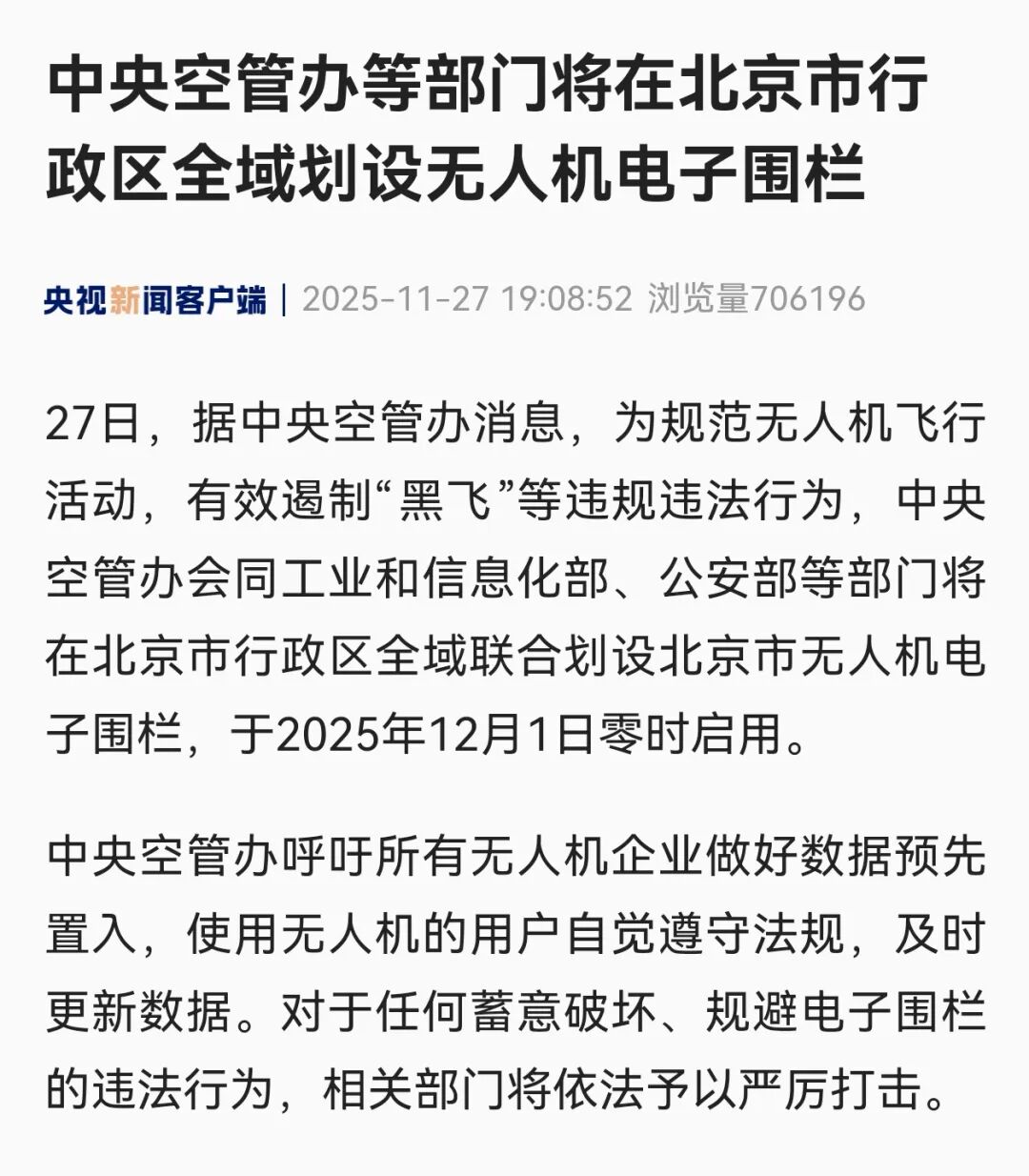 根据《北京市人民政府关于公布无人驾驶航空器管制空域范围的通告》,北京市行政区全域为无人驾驶航空器管制空域。再次提示大家,此通告系长期性规定,任何飞行活动均需要报备,未经空中交通管理机构批准实施飞行活动的就是“黑飞”。