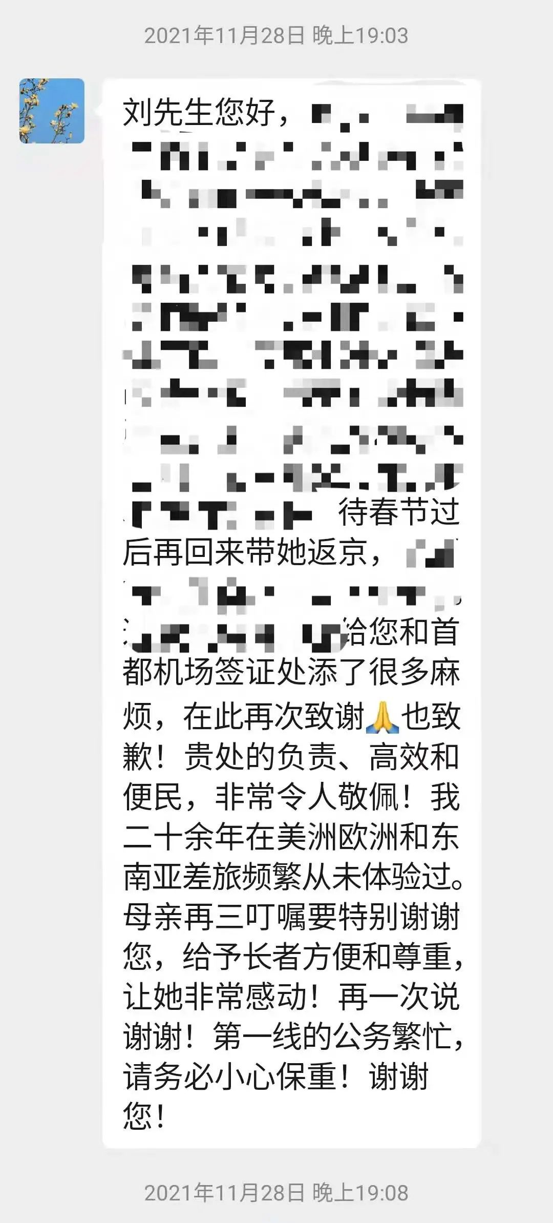 “贵处的负责、高效和便民,非常令人敬佩!我二十余年在美洲欧洲和东南亚差旅频繁,从未体验过(这样的服务)。”