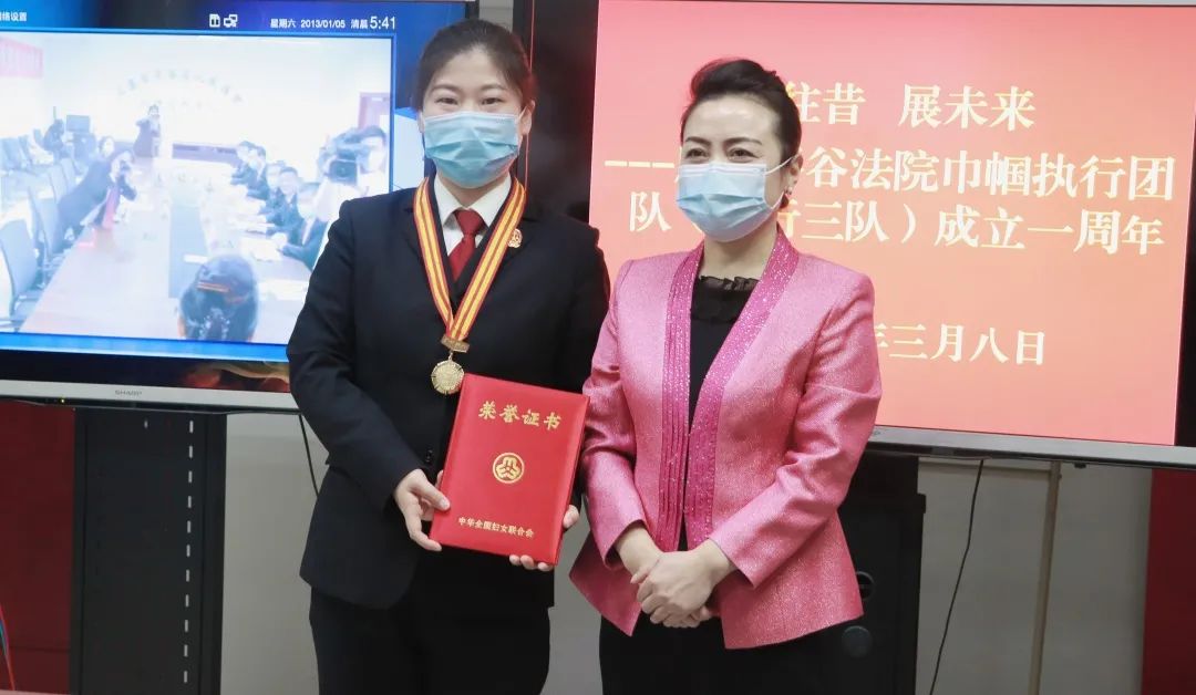 平谷区妇联领导同志前往平谷法院执行局开展座谈会,庆祝“巾帼执行团队”成立一周年,并为巾帼执行团队队长原婷婷颁发“全国维护妇女儿童权益先进个人”荣誉证书及奖章。团队成员对与会领导的关心、帮助和肯定表达了衷心的感谢,表示今后将一如既往,再接再厉,继续完善执行女干警“亲、勤、进、新”的工作模式,坚持团队“勤关切、细问询,行有速、为有则,宽有度、严有效”的工作方法,创造执行女干警服务人民群众的更新、更大业绩。