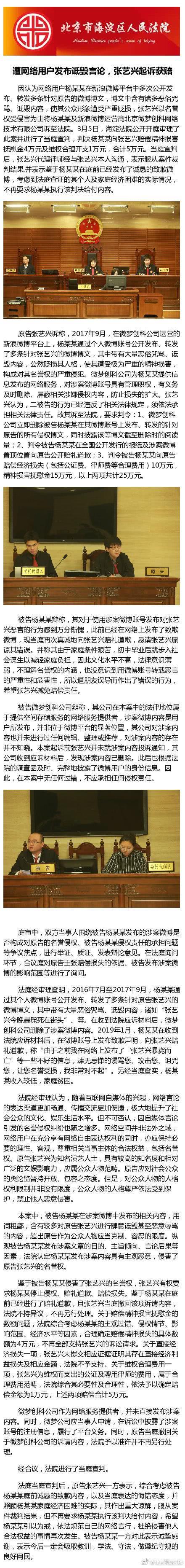 3月5日,北京海淀法院发布案件播报,称张艺兴诉杨某某侵犯名誉权一案并进行了当庭宣判,判决杨某某向张艺兴赔偿精神损害抚慰金4万元及维权合理开支1万元,合计5万元。