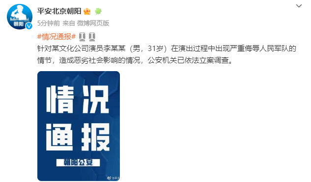 5月17日晚,北京市公安局朝阳分局发布情况通报:针对某文化公司演员李某某(男,31岁)在演出过程中出现严重侮辱人民军队的情节,造成恶劣社会影响的情况,公安机关已依法立案调查。