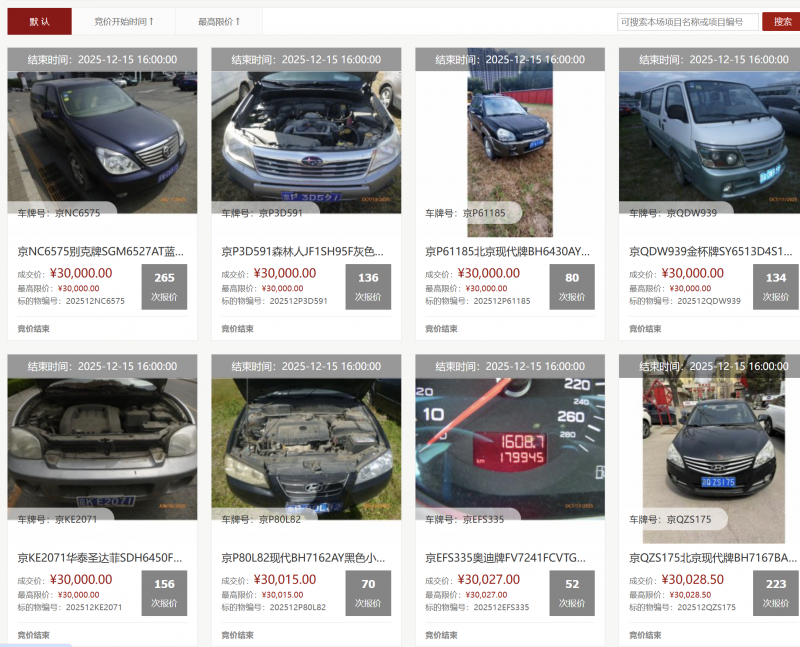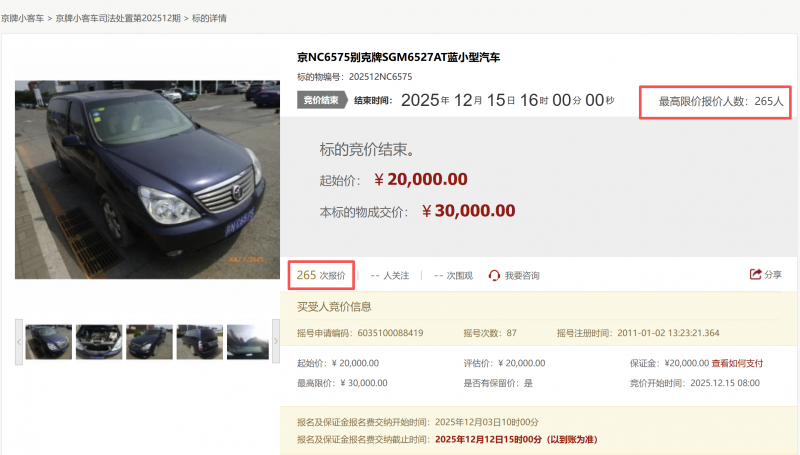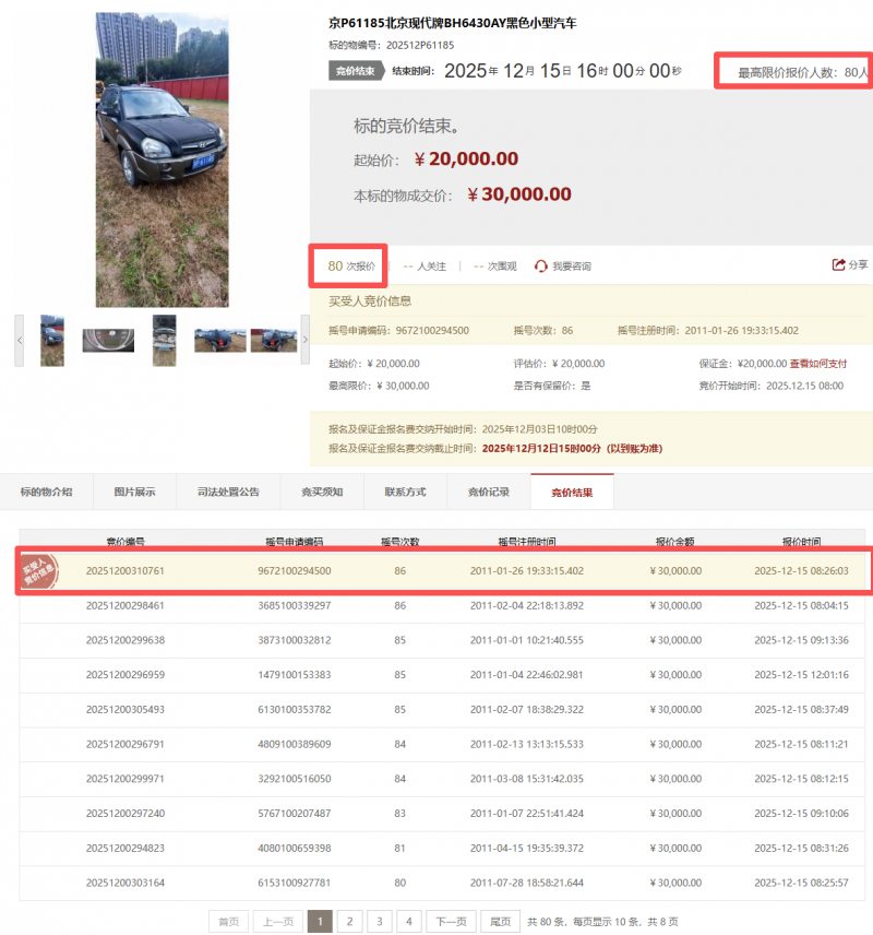记者注意到,本次司法处置活动中,最便宜的5辆小客车最受关注,起拍价均为2万元,最高限价3万元。其中一辆北京现代牌小客车最高限价报价人数只有80人。最终买受人摇号注册时间为2011年1月26日,参与过86次摇号。