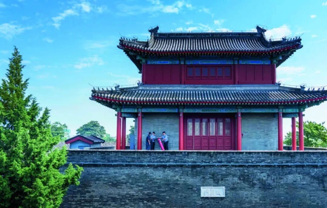 民警在宛平城城墙上检查安全隐患