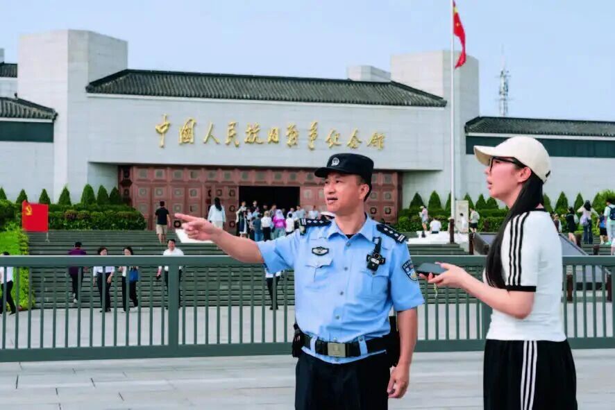 民警丁黎亮在中国人民抗日战争纪念馆前为游客引路
