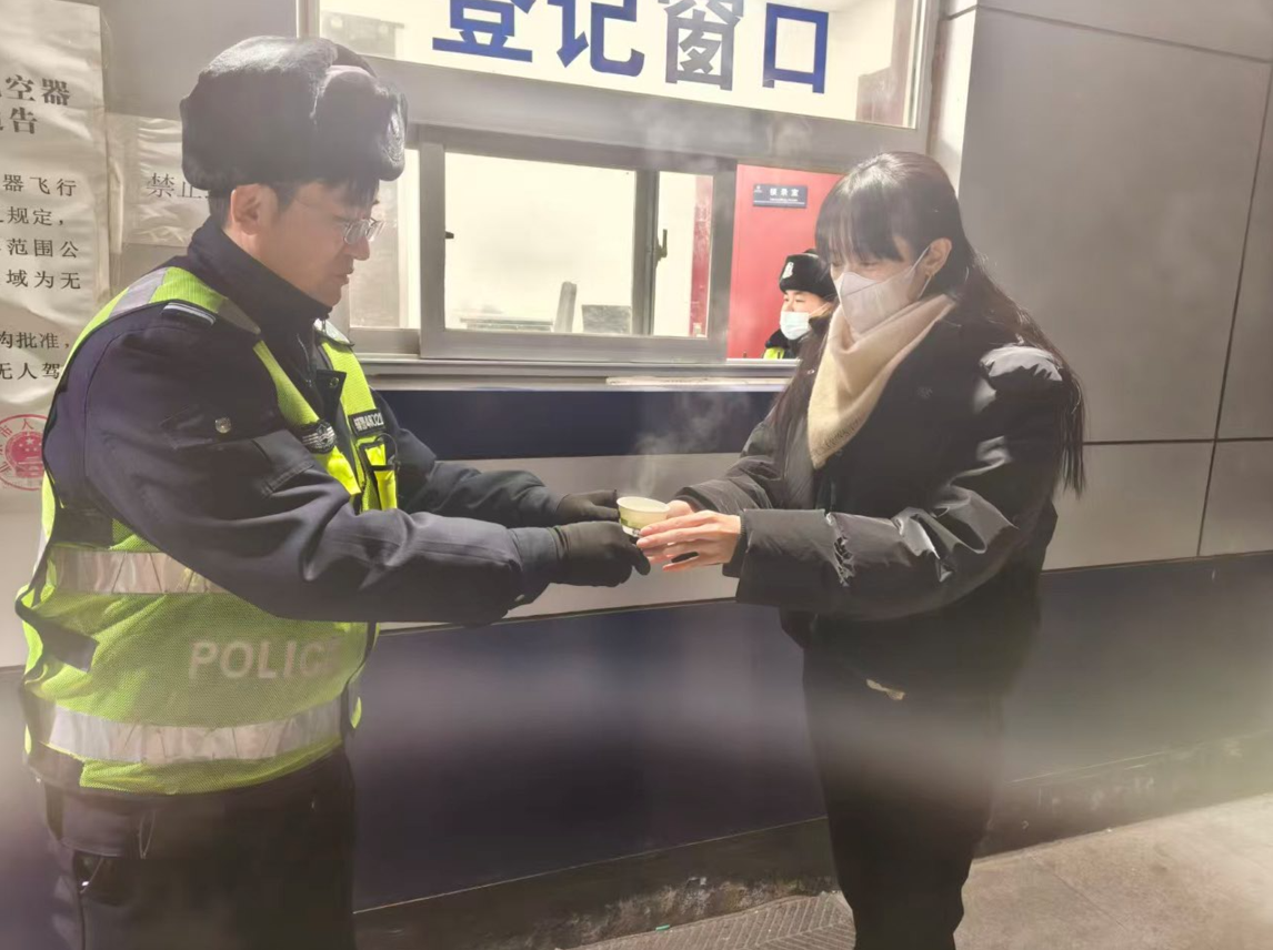 ▲房山分局窦店公安检查站民警为过站司机送上新年的第一杯热水