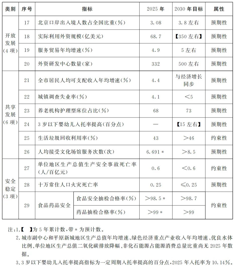 国际交往中心开放包容、融通世界。在谋划增强国际交往综合承载能力的同时,规划纲要提出了新指标——北京口岸出入境人数占全国比重。“十四五”期末这个指标达到3.08%;到了“十五五”时期,本市将要通过优化服务,让更多外国人把北京作为进入中国的第一站,北京口岸出入境人数占全国比重提升至3.8%左右。