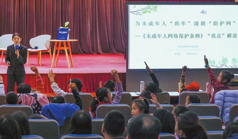 近日,北京市朝阳区人民法院大法庭内,欢笑声此起彼伏,这是该院“e起首护·网络法治星火行动”青少年网络普法与安全素养主题活动的现场。来自首都高校、互联网企业的专家代表共同普法,用生动有趣的形式普及法律知识。