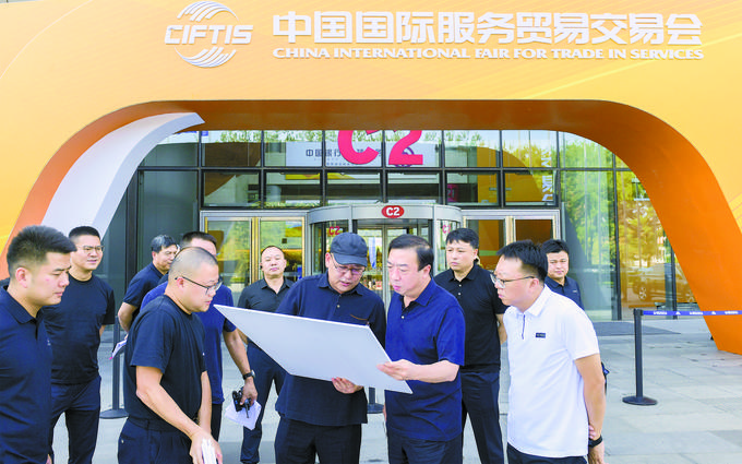2023年8月28日,董亦军(前排右二)在中国国际服务贸易交易会现场对交通服务保障工作进行踏勘。