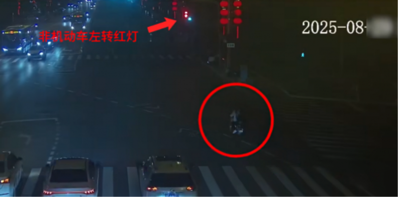 2025年8月29日晚间,在怀柔区于家园路口,一辆电动自行车在左转弯红灯时闯灯左转通过路口,与对向正常行驶的大型客车发生碰撞,电动自行车驾乘人员双双受伤。