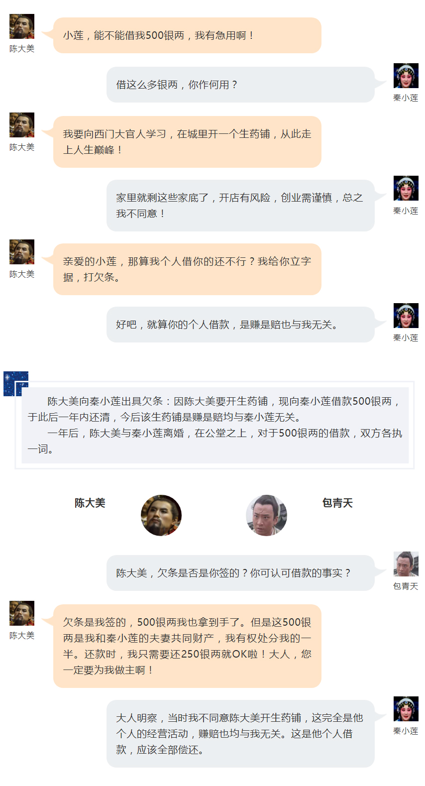 本案中,陈大美认可欠条的真实性,故双方存在借款的法律关系。陈大美辩称,该款项系夫妻共同财产,其有权处分其中的一半。但陈大美借款系为了个人开生药铺所用,即从事个人经营活动,并未用于夫妻共同生活,应视为双方约定处分夫妻共同财产的行为,故根据上述司法解释之规定,秦小莲有权要求陈大美按照借款协议的约定履行还款500银两的义务。