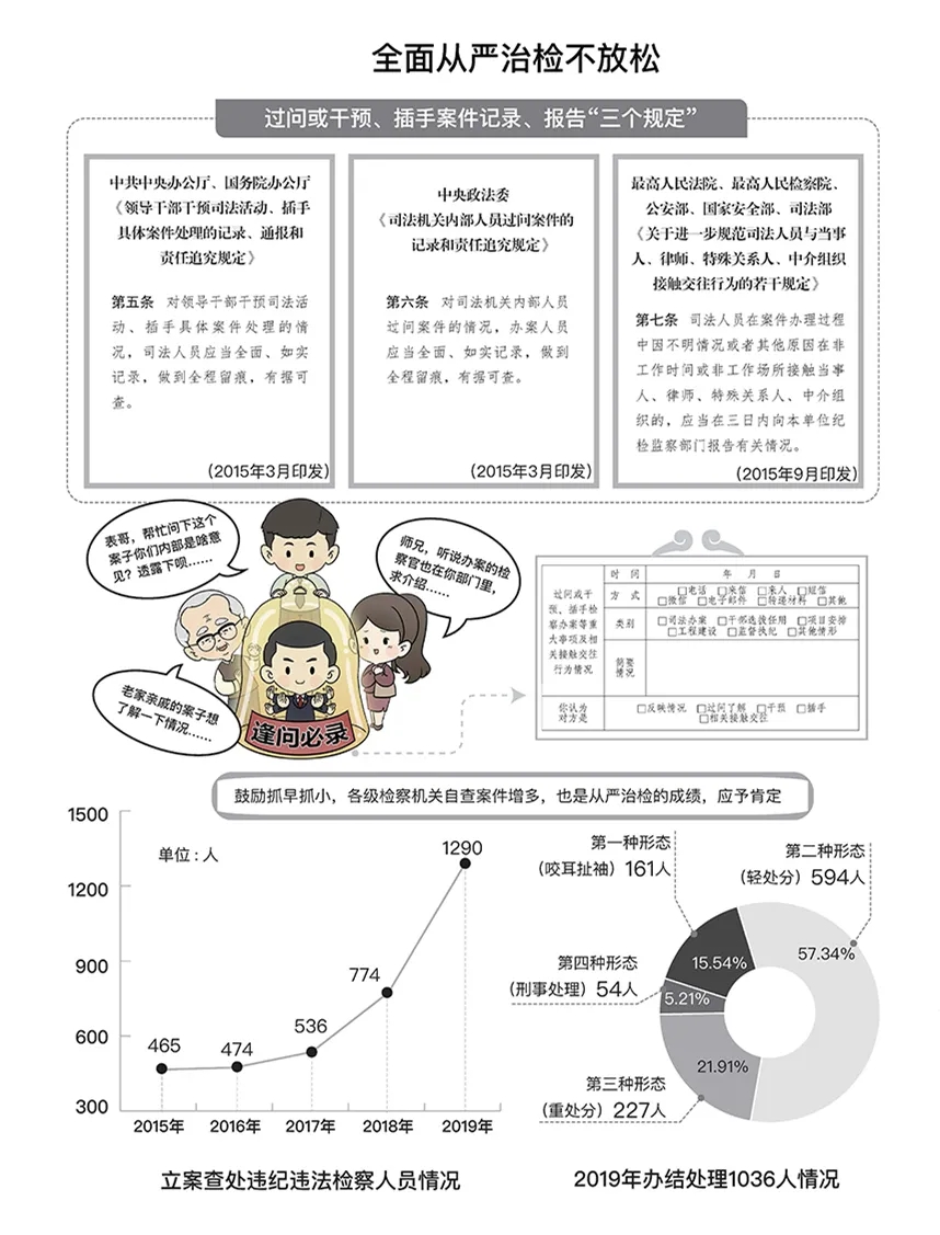 坚持全面从严治检。过问或干预、插手司法办案等重大事项须记录报告,中央和有关部门早有“三个规定”。“过问”主要是陈述情况、了解进展,多为监督公正司法;“记录、报告”有利约束检察官,防止人情案、关系案、金钱案。面对多数不实的“零报告”,最高人民检察院以上率下,要求“逢问必录”,不让“零报告”架空好规定。四级检察院全员覆盖、逐月报告,共记录报告2018年以来有关事项18751件。自觉接受各级纪委监委及派驻纪检监察组监督,以刮骨疗毒的勇气减存量、遏增量,包括最高人民检察院机关和事业单位6人在内的1290名检察人员因违纪违法被立案查处,同比上升66.7%,54人被追究刑事责任。坚持刀刃向内,从严查处为黑恶势力站台撑腰的检察人员42人。坚持实事求是,对严抓严管查处更多案件的给予肯定,鼓励抓早抓小,把管党治党主体责任落实。