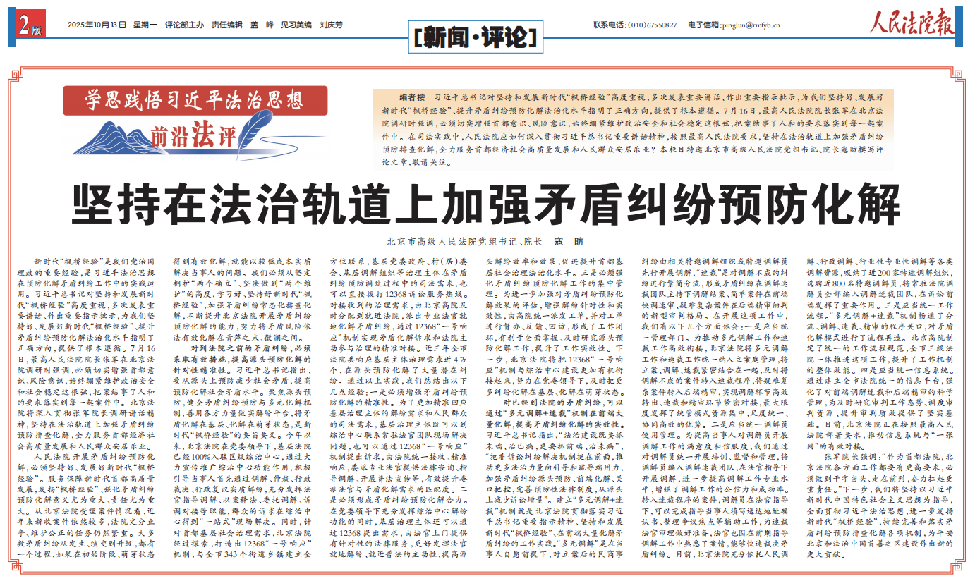 新时代“枫桥经验”是我们党治国理政的重要经验,是习近平法治思想在预防化解矛盾纠纷工作中的实践运用。习近平总书记对坚持和发展新时代“枫桥经验”高度重视,多次发表重要讲话、作出重要指示批示,为我们坚持好、发展好新时代“枫桥经验”、提升矛盾纠纷预防化解法治化水平指明了正确方向,提供了根本遵循。7月16日,最高人民法院院长张军在北京法院调研时强调,必须切实增强首都意识、风险意识,始终绷紧维护政治安全和社会稳定这根弦,把案结事了人和的要求落实到每一起案件中。北京法院将深入贯彻张军院长调研讲话精神,坚持在法治轨道上加强矛盾纠纷预防排查化解,全力服务首都经济社会高质量发展和人民群众安居乐业。