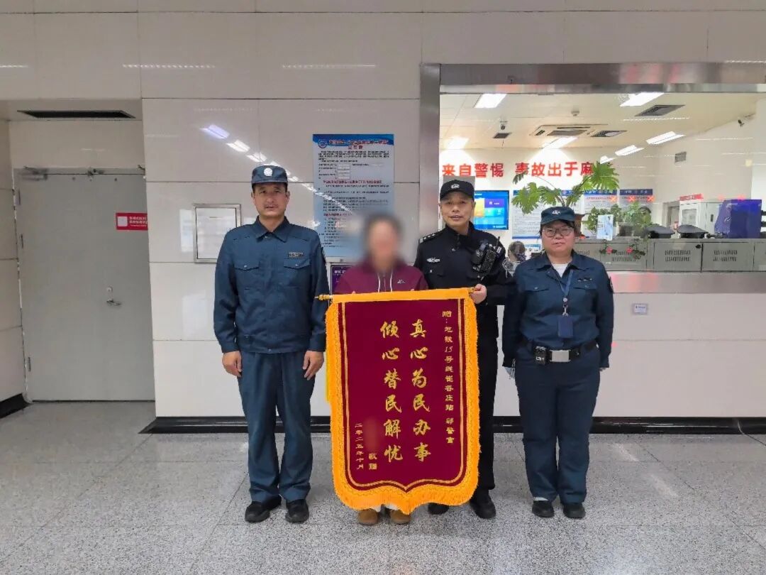 2025年10月15日,苹果园站派出所民警张迪在执勤中发现乘客遗失的书包。经清点,包内装有失主的房产证、购房合同、户口本、结婚证及钱包等重要物品。张迪第一时间上报情况,并立即着手查找。经多方努力,最终联系上失主李心红及其妻子陈珍红。失主表示万分感激,称刚发现包丢失就接到找回的电话,心情从惊慌转为惊喜,要为民警的高效负责点赞。