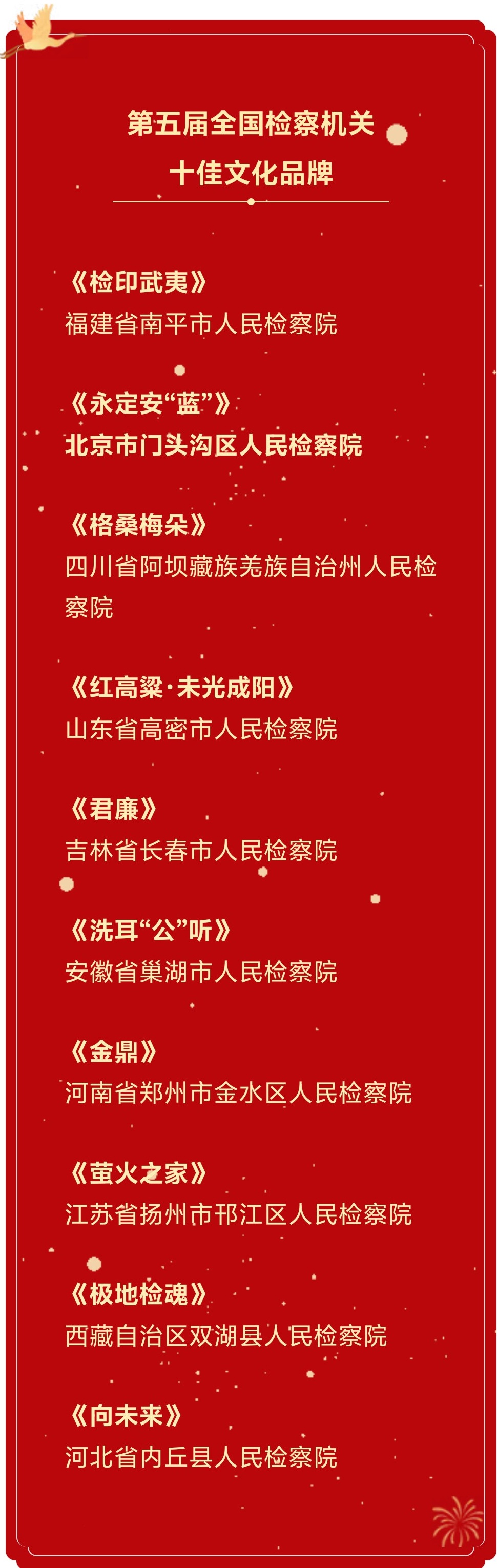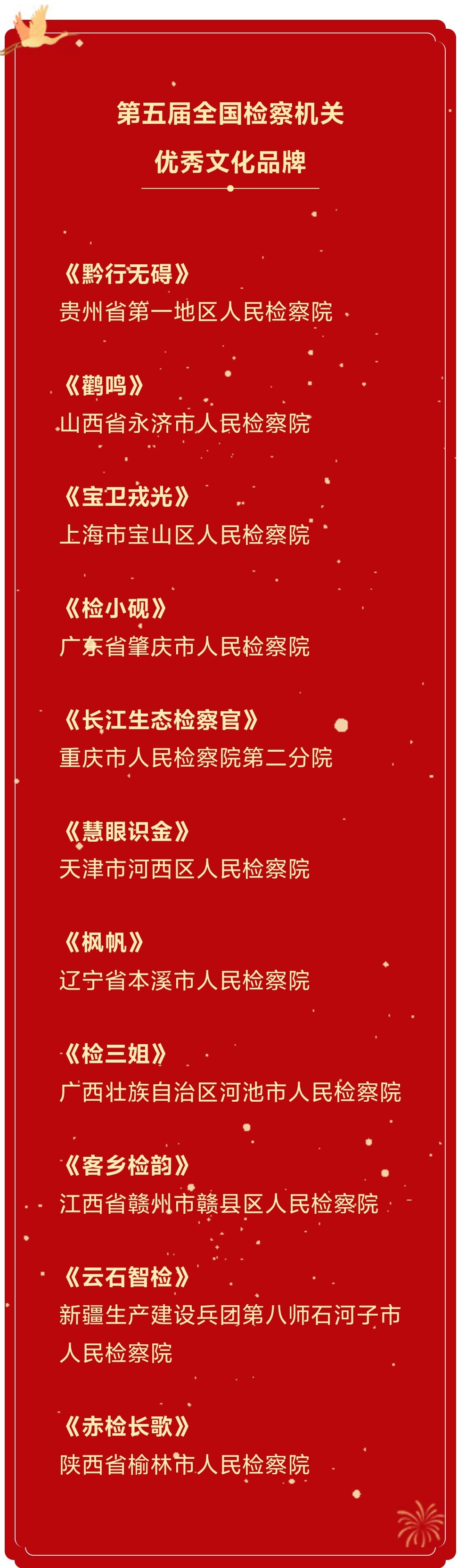 定评会上,经由全国人大代表、中央国家机关有关部门负责人和文化界专家等评委无记名投票,福建省南平市检察院报送的《检印武夷》等10个检察文化品牌被评为第五届全国检察机关十佳文化品牌,贵州省第一地区检察院报送的《黔行无碍》等11个检察文化品牌被评为第五届全国检察机关优秀文化品牌。