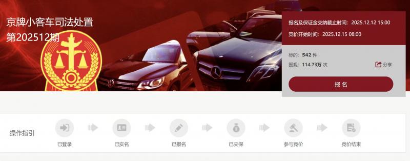 12月3日,北京法院启动2025年第二期京牌小客车司法处置工作,此次参与拍卖的有542辆京牌小客车(带指标)。12月3日到12月12日,所有车辆将在北京朝阳进行预展,方便竞拍者提前查看车况。