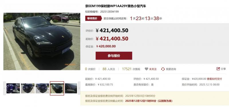 与此同时,另外一辆保时捷小型汽车也受到1.74万次围观。公开信息显示,该车辆的评估价在本次司法处置中最高,为42.14万元。该车辆的初次登记日期为2018年12月10日,里程表显示行驶里程为24068公里,目前没有可查违章记录,经过评估,该车辆可能产生相应停车、维修等费用为3875元(最终将由买受人承担)。