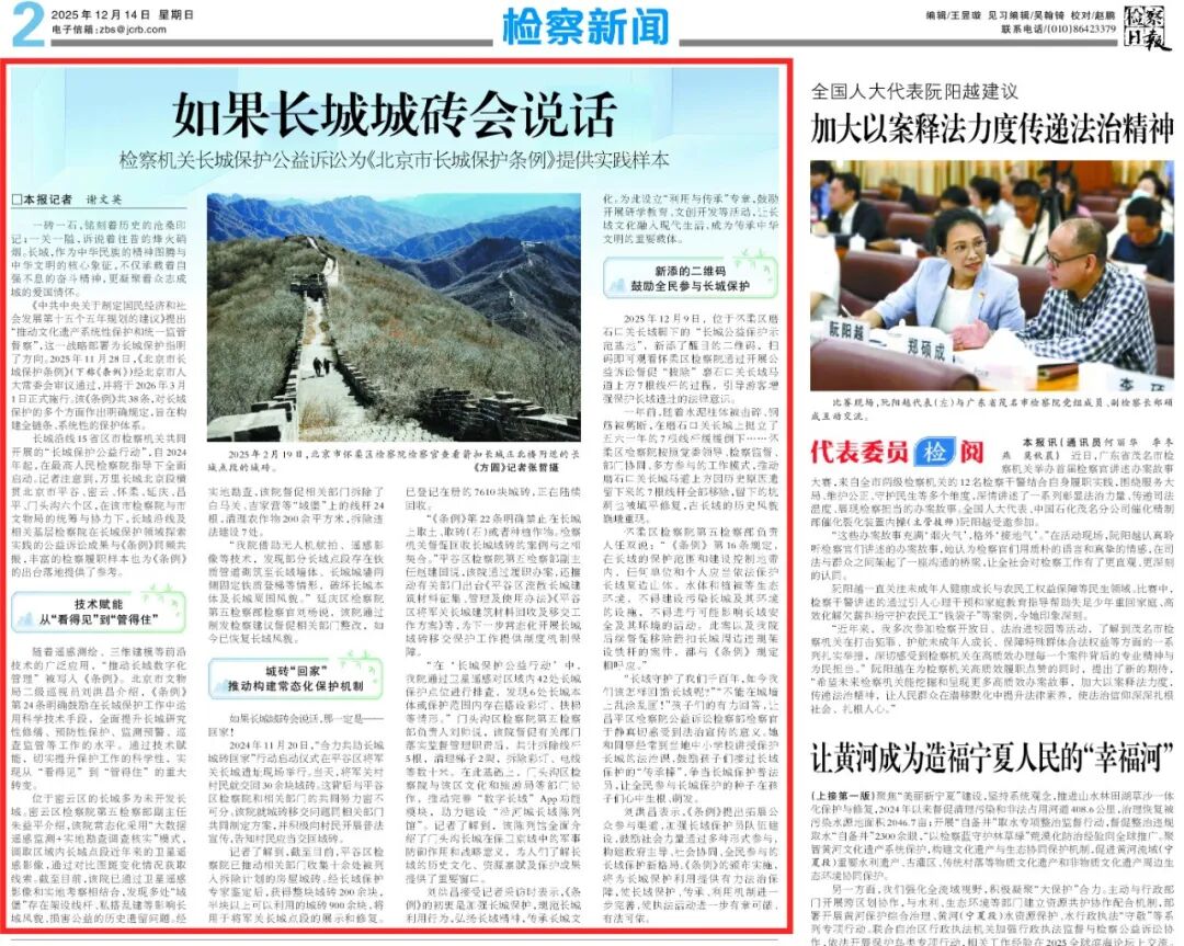 长城沿线15省区市检察机关共同开展的“长城保护公益行动”,自2024年起,在最高人民检察院指导下全面启动。记者注意到,万里长城北京段横贯北京市平谷、密云、怀柔、延庆、昌平、门头沟六个区,在该市检察院与市文物局的统筹与协力下,长城沿线及相关基层检察院在长城保护领域探索实践的公益诉讼成果与《条例》同频共振,丰富的检察履职样本也为《条例》的出台落地提供了参考。
