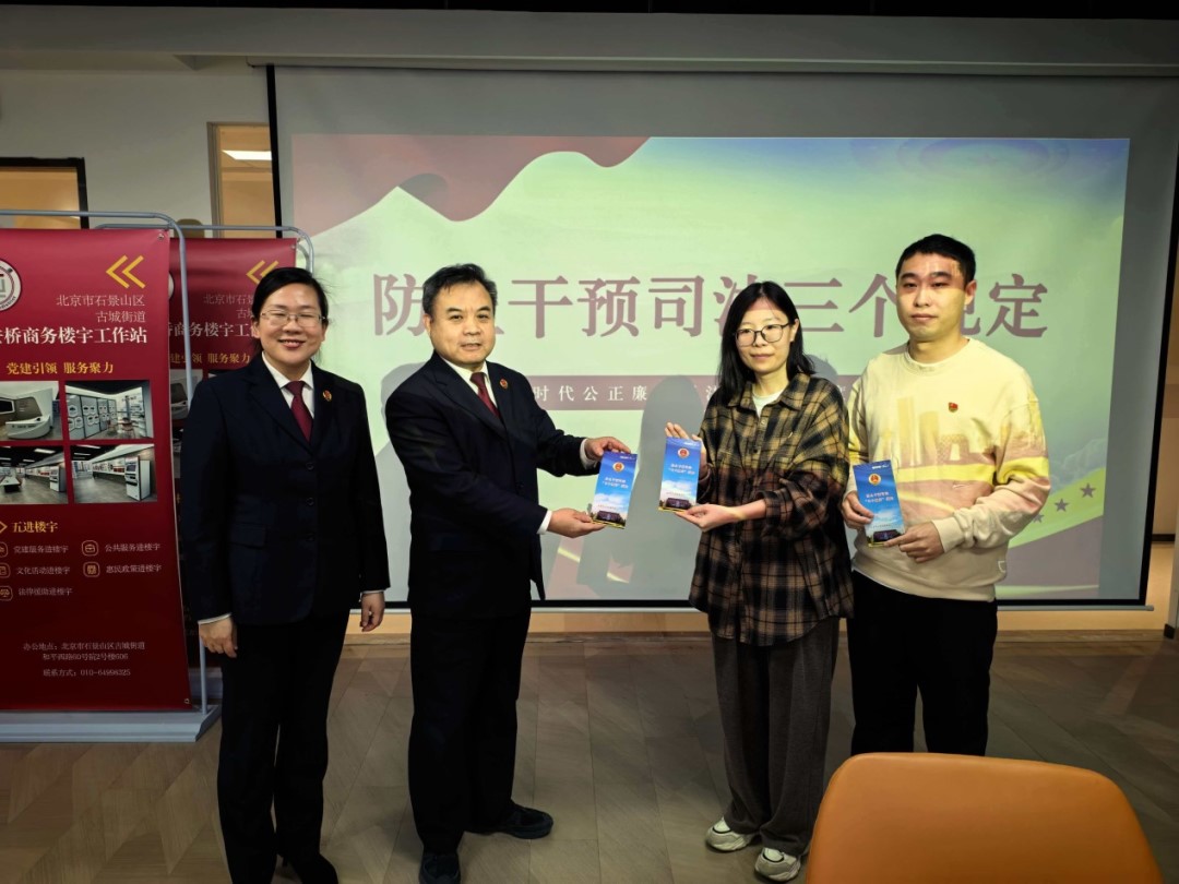 为学习宣传贯彻党的二十届四中全会精神,扎实推进党建与业务工作深度融合,践行司法为民宗旨,近日,北京市人民检察院第一分院检察侦查部党支部联合职务犯罪检察部党支部,组织干警们前往古城街道金安桥商务楼宇,与楼宇工作站党支部携手开展“普法宣传进社区,服务群众零距离”主题党日活动,面向企业员工代表进行普法宣讲。