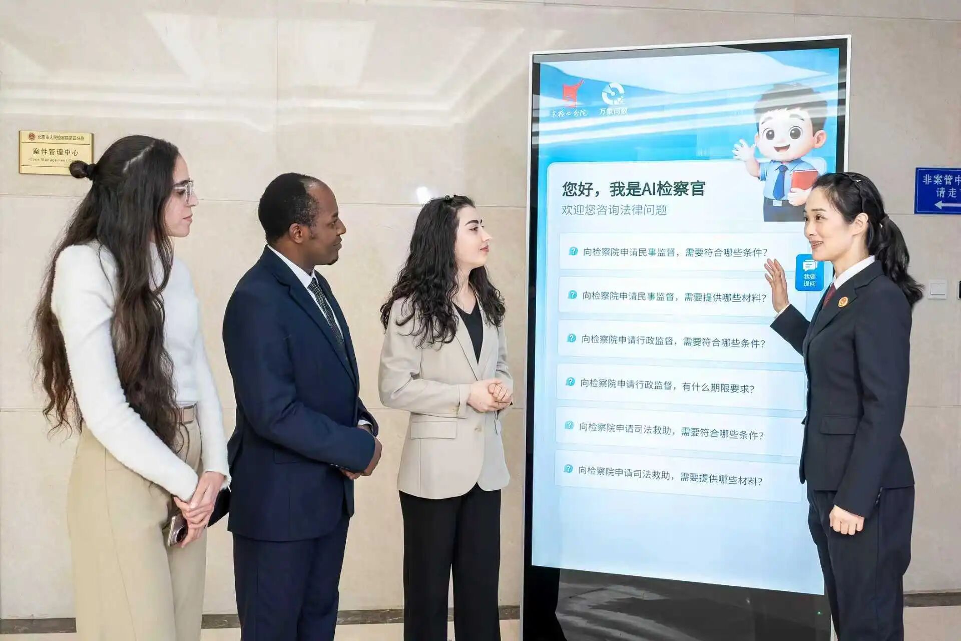 2025年12月23日,北京市检察院第四分院AI检察官用阿拉伯语向对外经贸大学3名摩洛哥留学生介绍民事法律监督程序。