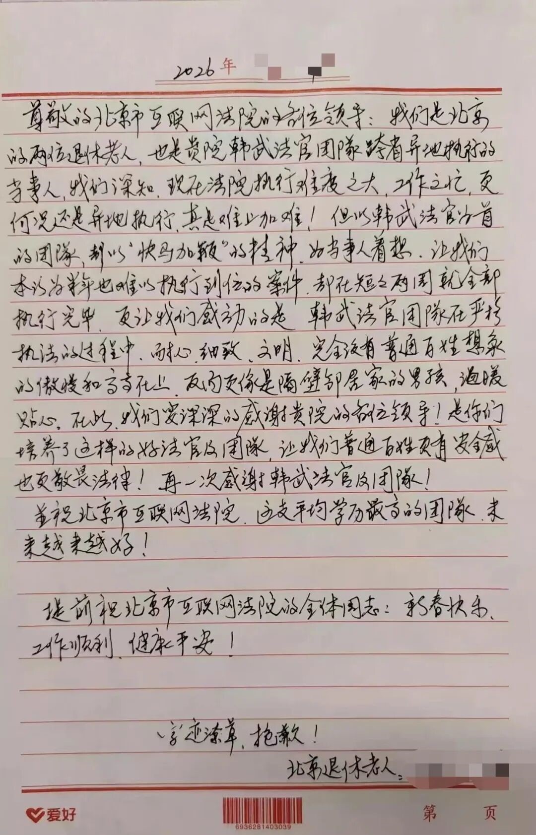 “以韩武法官为首的团队,以快马加鞭的精神,为当事人着想,让我们本以为半年也难以执行到位的案件,却在短短两周就全部执行完毕……韩武法官团队在严格执法的过程中,耐心、细致、文明……”近日,北京互联网法院收到一封手写感谢信。一名当事人在信中为法院司法拍卖成交后的腾房速度与办理过户效率点赞,对执行干警的高效履职表达谢意。