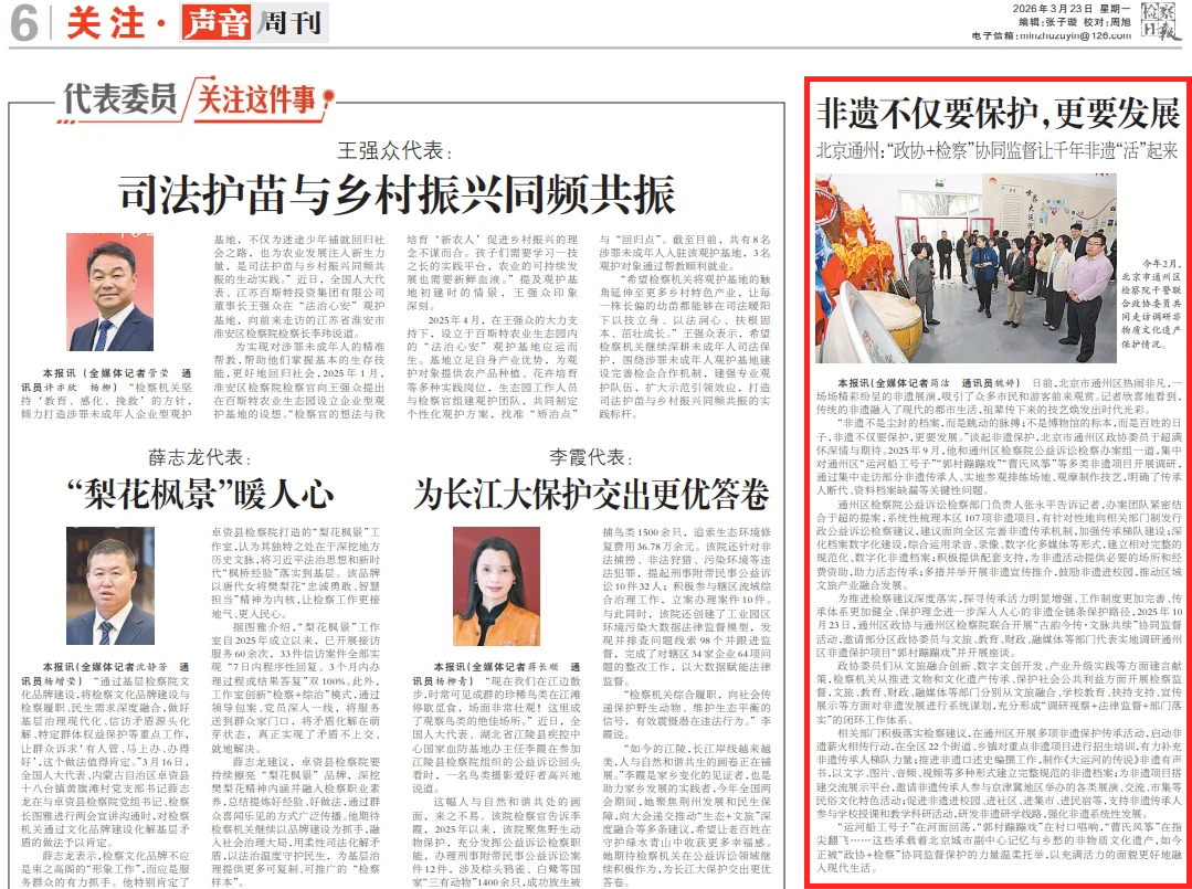“非遗不是尘封的档案,而是跳动的脉搏;不是博物馆的标本,而是百姓的日子,非遗不仅要保护,更要发展。”谈起非遗保护,北京市通州区政协委员于超满怀深情与期待。2025年9月,他和通州区检察院公益诉讼检察办案组一道,集中对通州区“运河船工号子”“郭村蹦蹦戏”“曹氏风筝”等多类非遗项目开展调研,通过集中走访部分非遗传承人、实地参观排练场地、观摩制作技艺,明确了传承人断代、资料档案缺漏等关键性问题。
