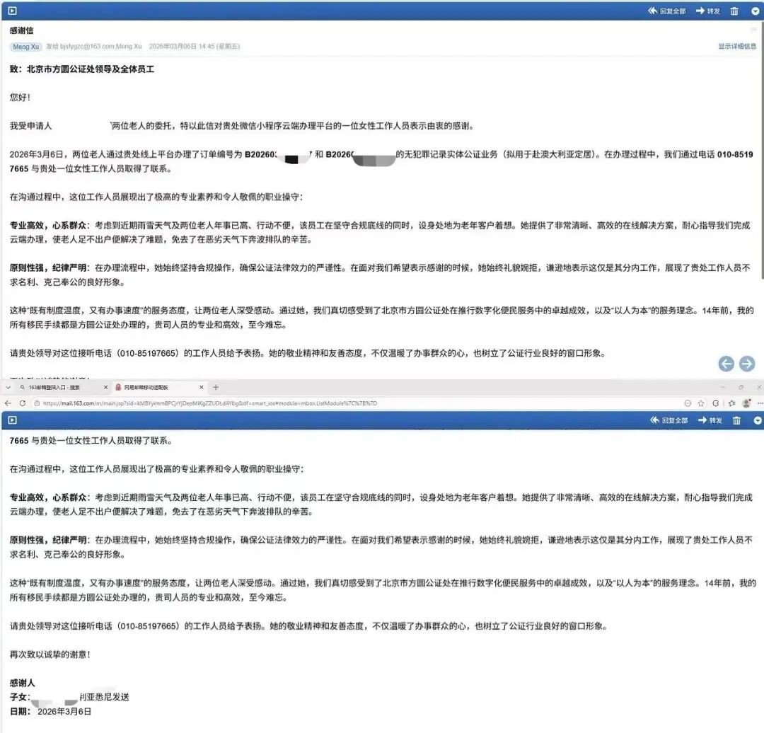 这种“既有制度温度,又有办事速度”的服务,感动了徐先生一家。徐先生在信中写道:“通过她,我们真切感受到了北京市方圆公证处在数字化便民服务中的卓越成效与‘以人为本’的服务理念。”