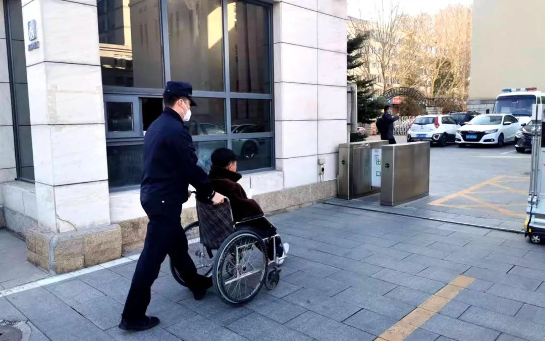 门头沟法院法警利用无障碍电梯帮助行动不便的老人。