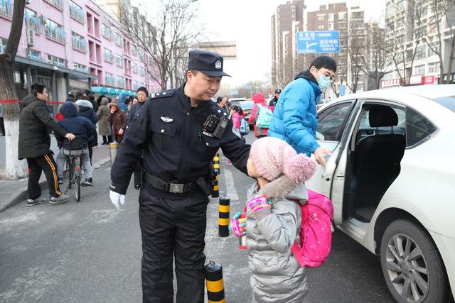2019年1月9日早7点,在中国人民大学附属小学门口,海淀公安分局曙光派出所民警已佩戴单警装备到“高宝来爱民服务岗”执行高峰勤务工作,在学校门前疏导、指挥来往车辆,护送孩子们安全进入学校。此时,海淀分局民警都深入辖区校园值守“宝来岗”,冒着严寒给学生们筑起一道安全屏障。