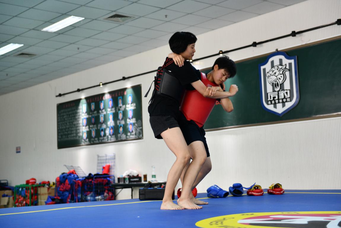 对抗是每天的必修课。直拳、摆拳、勾拳、高边腿、正蹬……一连串的组合,马亦男打得虎虎生威。虽然每天的训练枯燥乏味,但是她从没放弃训练。