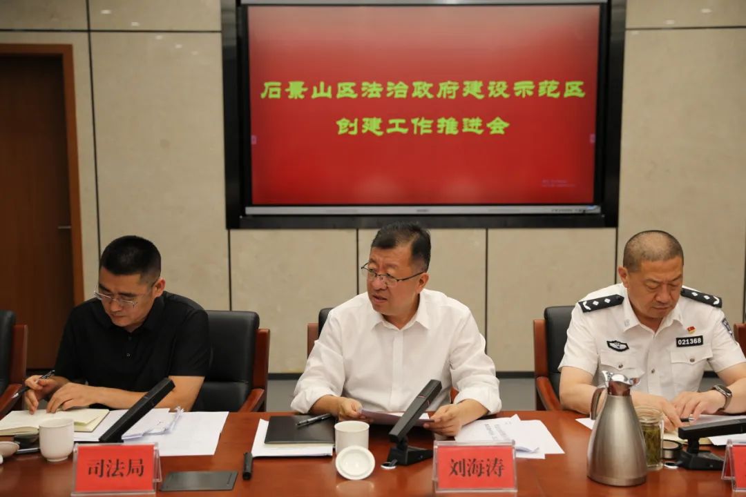 7月7日,北京市石景山区召开法治政府建设示范区创建工作推进会。会议阶段性总结了法治政府建设示范区材料申报准备工作情况,并安排部署下一步工作。区委副书记、政法委书记,区创建全国法治政府建设示范区工作小组常务副组长刘海涛出席会议并发表讲话,区政府党组成员、副区长,区创建全国法治政府建设示范区工作小组副组长(兼创建办主任)刘锋主持会议。