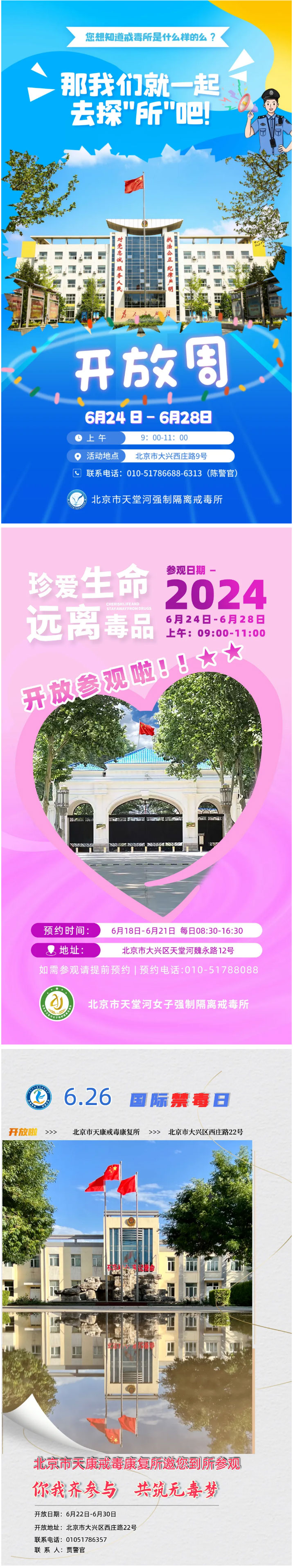 3家开放单位集中开放时间为6月24日至28日。天康戒毒康复所考虑到学生还没有放假,工作日不方便来所参观,在集中开放时间的基础上,向前、向后延伸一个周末,开放时间为6月22日至30日。