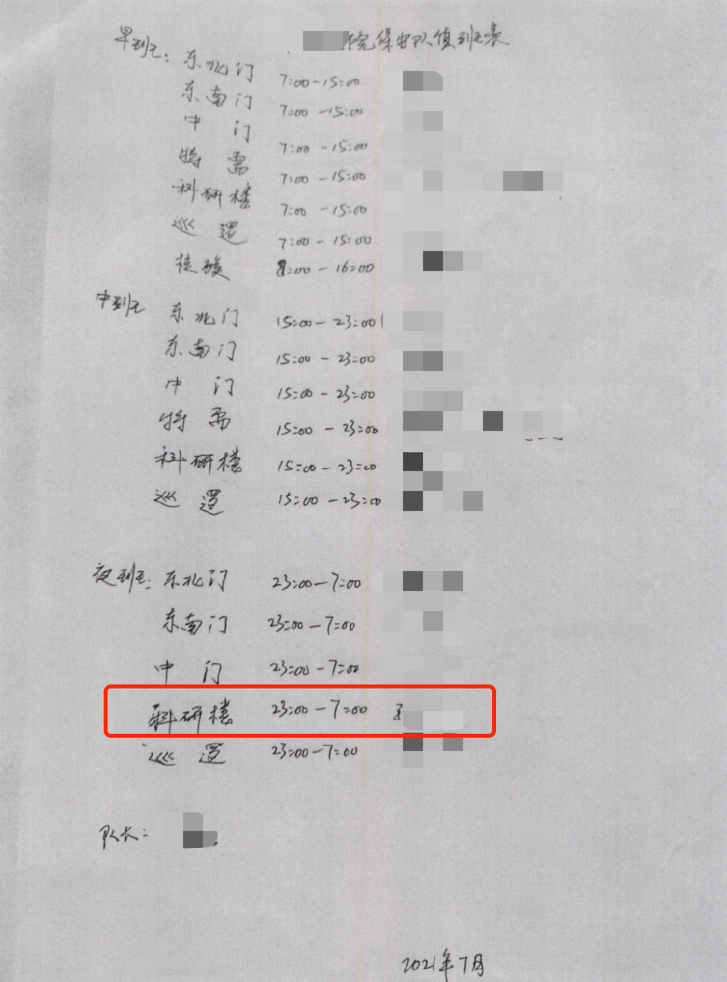 王某之妻提交的医院保安队值班表,显示有“夜班:科研楼23:00-7:00 王某”字样。