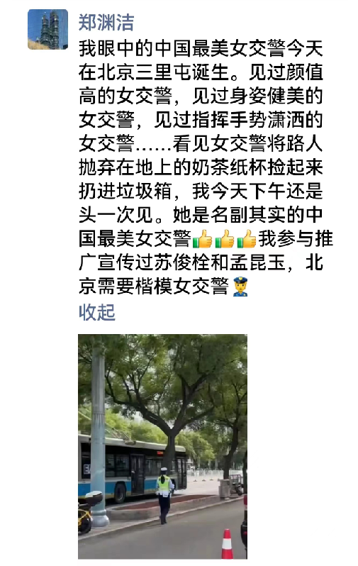 近日,新加入女警铁骑的熊珺瑶在三里屯巡逻的时候看到一个被丢弃的饮料杯落在非机动车车道上,为防止非机动车和行人因此出现滑倒的情况,她立即下车将废饮料杯捡起扔进垃圾桶,恰巧这一幕被有“童话大王”之称的著名作家郑渊洁捕捉到。他在微信朋友圈中写道:“……见过颜值高的女交警,见过身姿健美的女交警,见过指挥手势潇洒的女交警……看见女交警将路人抛弃在路上的奶茶纸杯捡起来扔进垃圾箱,我今天下午还是头一次见。她是名副其实的中国最美女交警……”并连续点了三个赞。