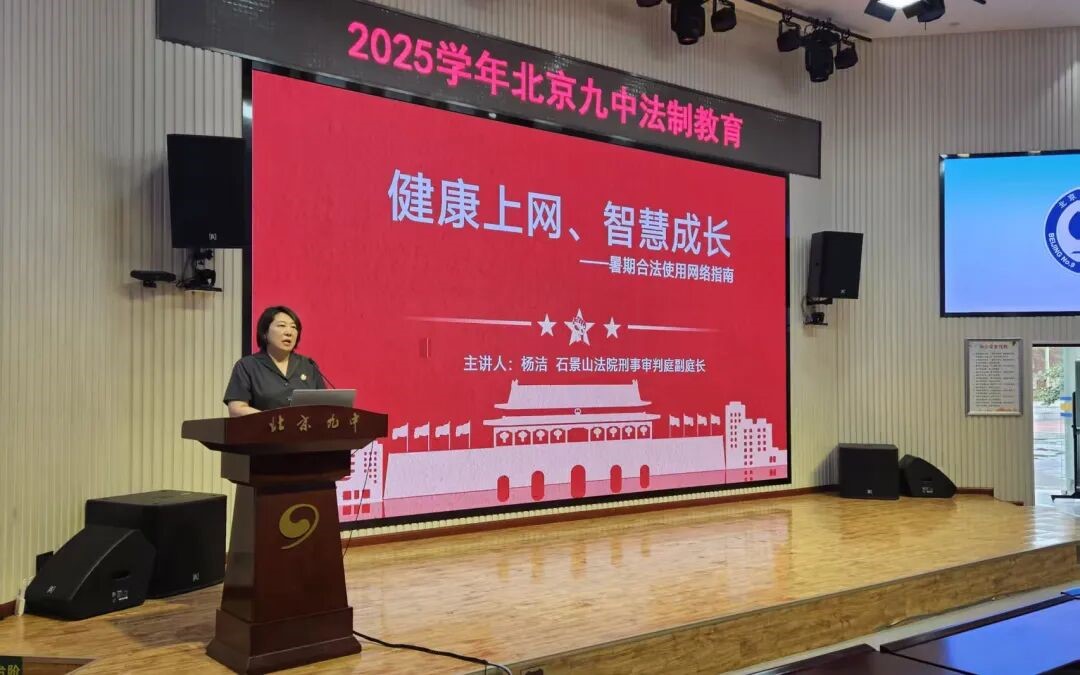 7月11日,刑庭副庭长杨洁受邀走进北京市第九中学高中部,为师生们带来了一场主题为“智慧上网、健康成长”的生动普法讲座。