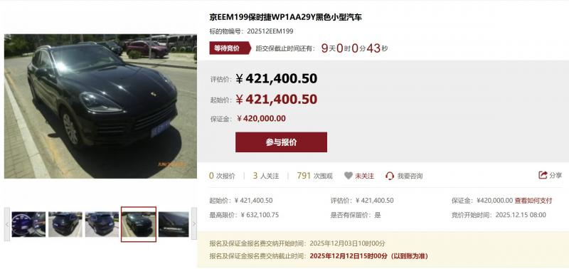 记者注意到,本次司法处置的小客车中,评估价最高的42.14万元,是一辆2018年的保时捷小型汽车,该车辆初次登记日期为2018年12月10日,图片显示里程表显示行车里程(约)24068km,目前查违章记录无违章、无罚款。