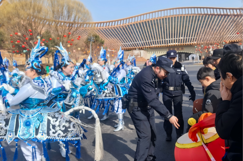 上午10时,花会展演正式开始,世园公园内锣鼓喧天、热闹非凡,延庆警方执勤警力早已提前到岗到位,开启“守护模式”。在各展演点位,民警坚守岗位,引导观众文明观演,及时疏导密集人流,提醒市民注意安全,避免拥挤;在公园出入口和周边道路,交管警力全力做好交通疏导,耐心解答市民咨询,引导车辆有序停放,保障现场及周边交通畅通。