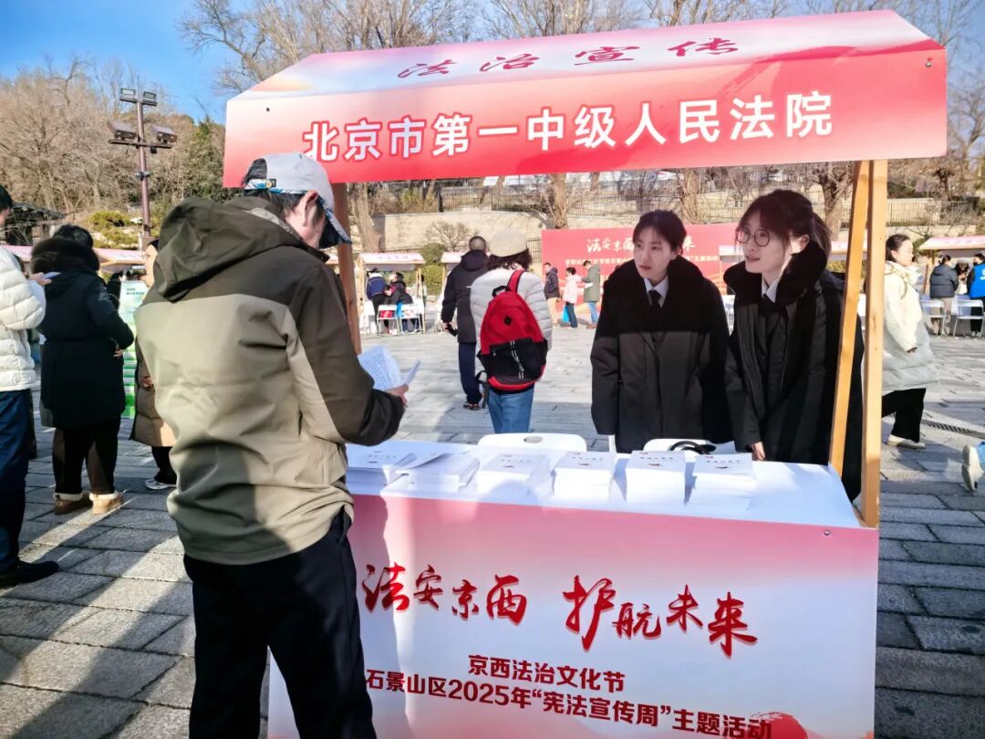 北京市第一中级人民法院参加“法安京西 护航未来”京西法治文化节暨2025年石景山区“宪法宣传周”主题活动。活动现场,干警通过设立普法展台、发放普法口袋书、提供法律咨询等形式,向群众普及法律知识、解答法律疑问。