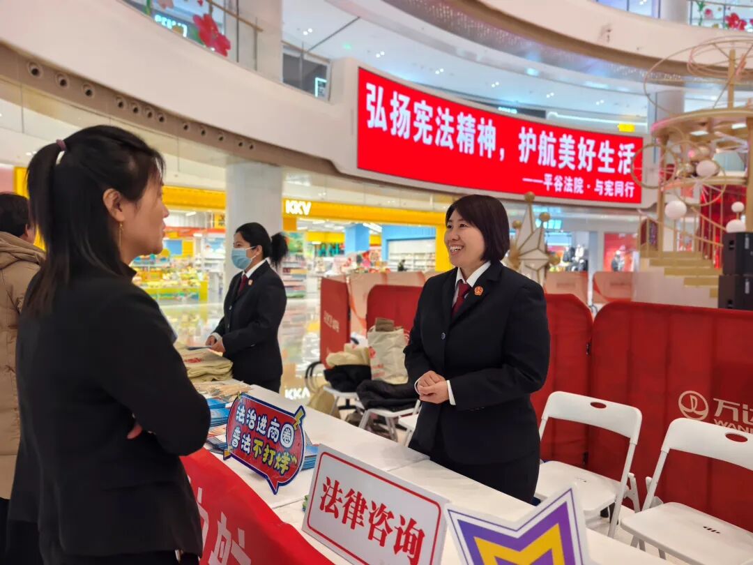 北京市平谷区人民法院东高村人民法庭干警走进辖区商场开展“弘扬宪法精神 护航美好生活”主题普法活动,法律咨询台与流动普法岗双线联动,以面对面、走心式普法,让法律知识融入商圈烟火,服务百姓生活。