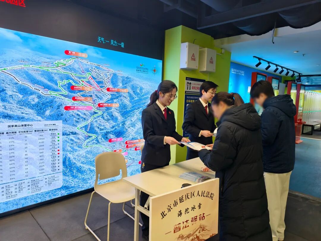 北京市延庆区人民法院依托“海陀冰雪”普法驿站,走进国家高山滑雪中心,开展“宪法暖冬行,法护冰雪梦”国家宪法日宣传活动。工作人员现场为游客提供面对面的宪法宣传及法律咨询,解答涉及旅游权益、消费保障、冰雪运动侵权等法律问题,并发放宪法精神宣传折页、青少年参与冰雪运动安全风险提示手册等各类资料。