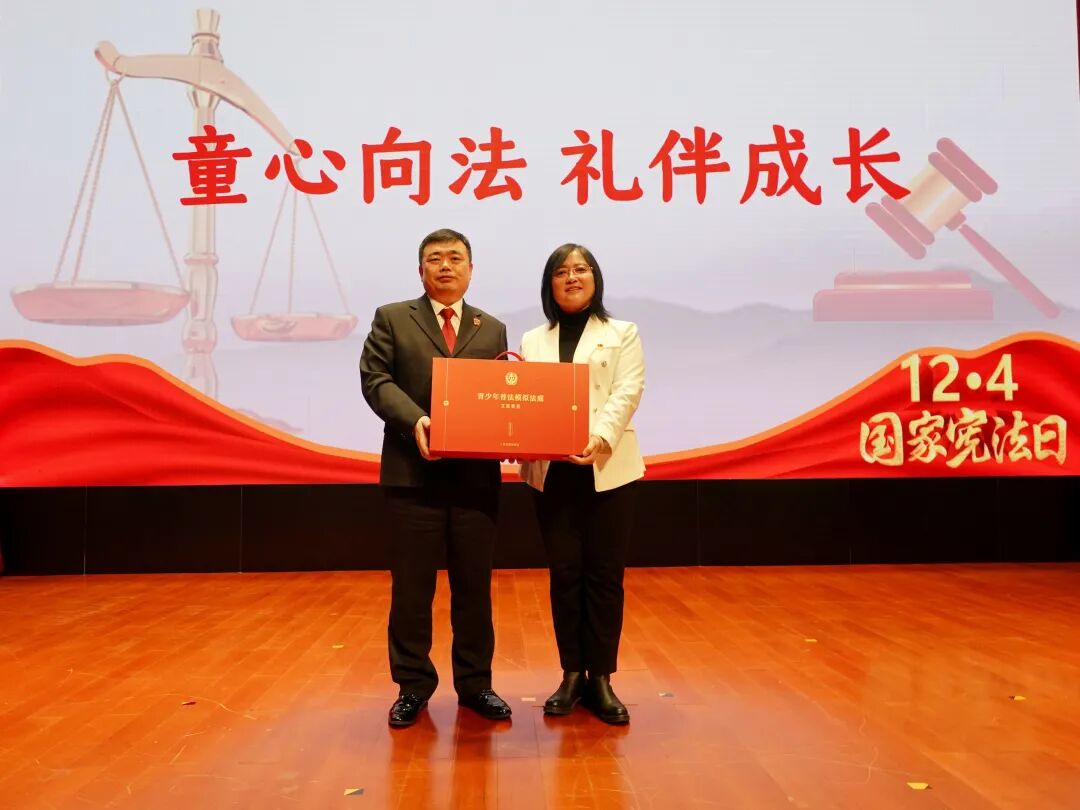 北京市昌平区人民法院开展“法治伴我成长 争做守法小公民”国家宪法日主题法院开放日活动,二毛学校150余名师生代表走进法院。活动中,昌平法院党组书记、院长、二毛学校法治副校长周瑞生向学校赠送“青少年普法模拟法庭文宣套装”。