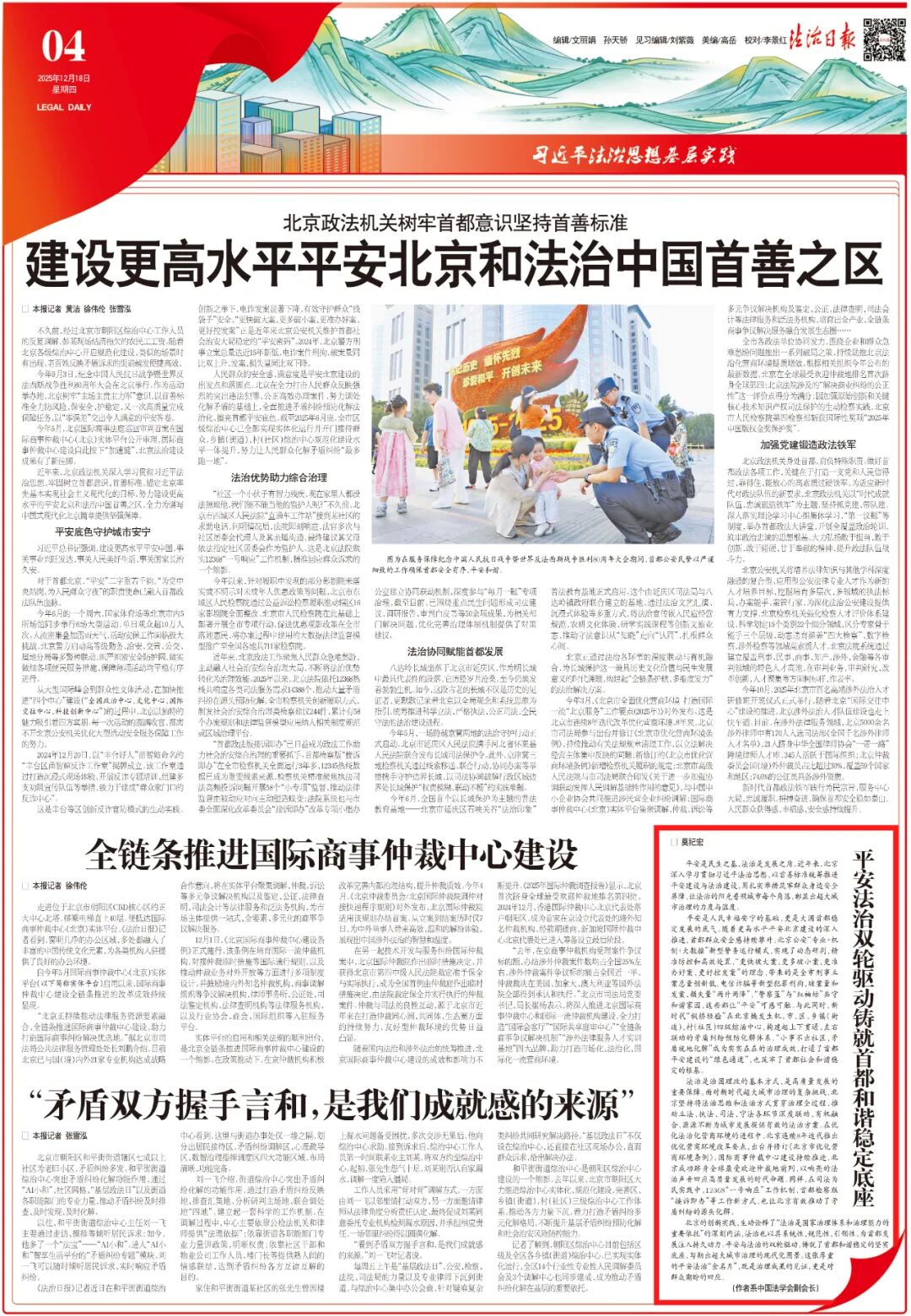 平安是民生之基,法治是发展之盾。近年来,北京深入学习贯彻习近平法治思想,以首善标准统筹推进平安建设与法治建设,用扎实举措筑牢群众身边安全屏障,让法治的阳光普照城市每个角落,彰显出超大城市治理的力度与温度。
