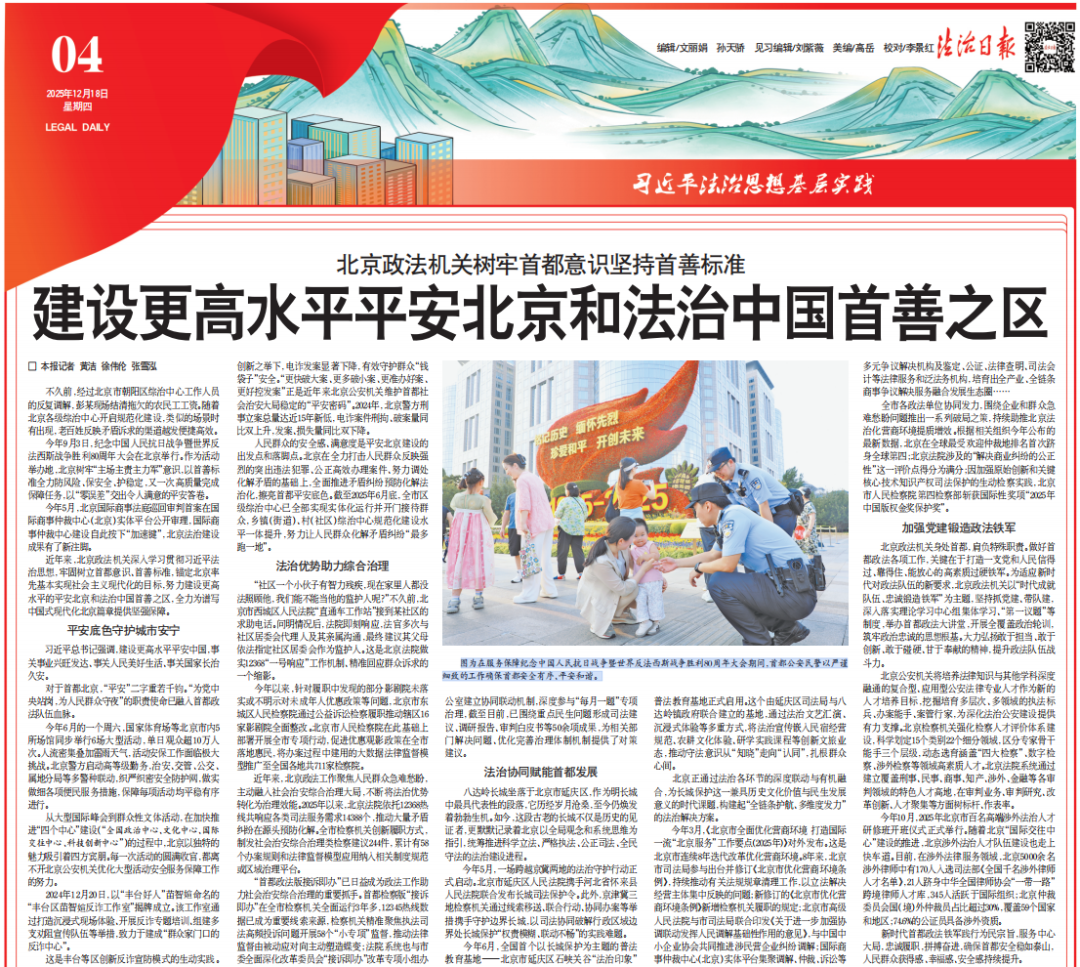 近年来,北京政法机关深入学习贯彻习近平法治思想,牢固树立首都意识、首善标准,锚定北京率先基本实现社会主义现代化的目标,努力建设更高水平的平安北京和法治中国首善之区,全力为谱写中国式现代化北京篇章提供坚强保障。