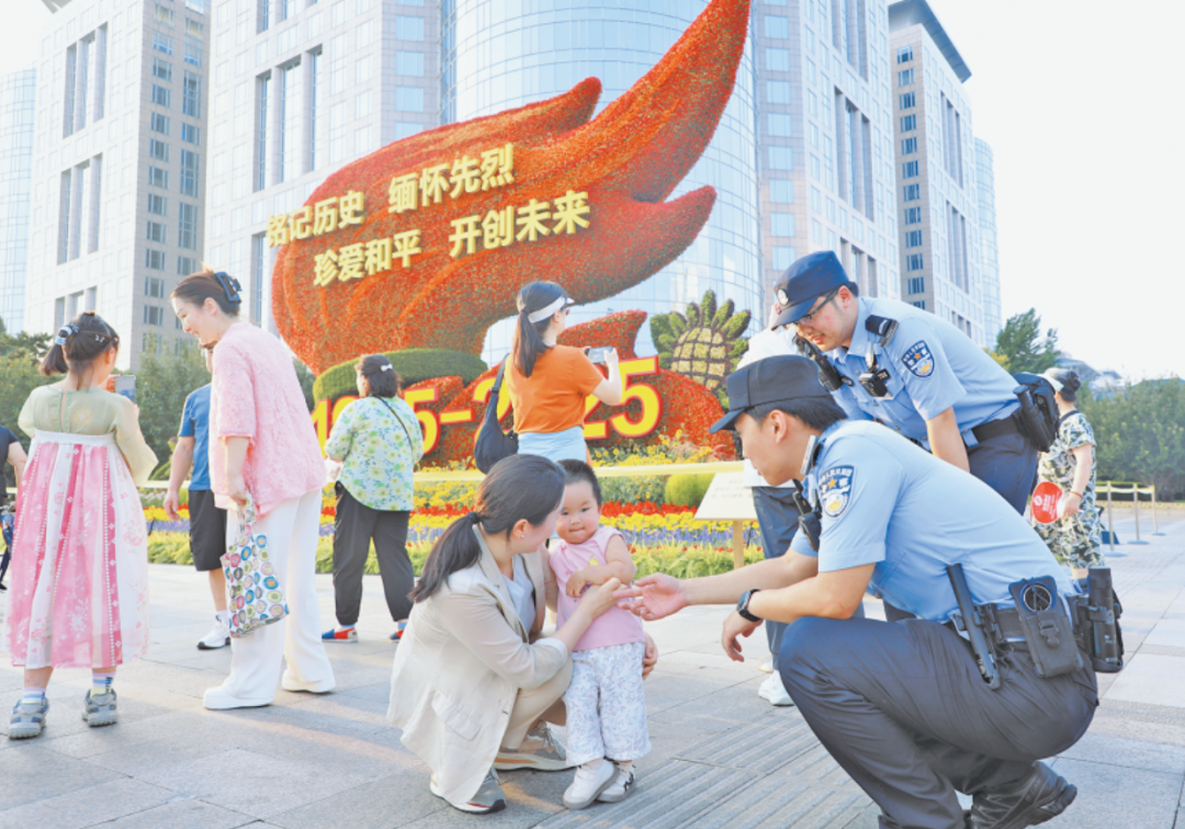 图为在服务保障纪念中国人民抗日战争暨世界反法西斯战争胜利80周年大会期间,首都公安民警以严谨细致的工作确保首都安全有序、平安和谐。