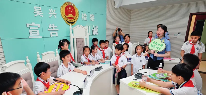 浙江省湖州市吴兴区人民检察院检察官带领小学生参观未成年人检察办案区(2024年7月3日摄) 黄宗治摄/本刊