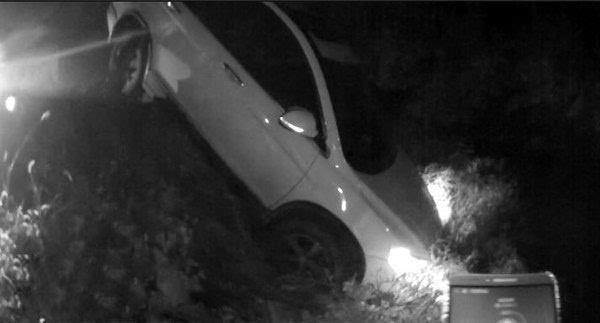 13日晚,一辆白色小汽车由于天气原因不慎驶入沟里