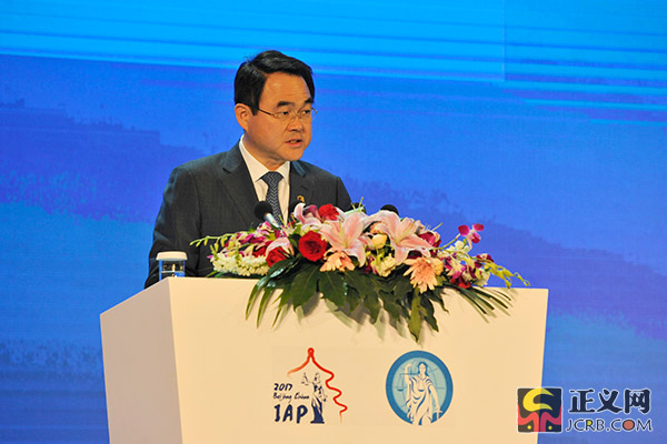 9月13日上午,第二十二届国际检察官联合会年会暨会员代表大会举行第三次全体会议。图为IAP副主席、韩国大邱检察院检察长黄成宇发言。闫昭 摄